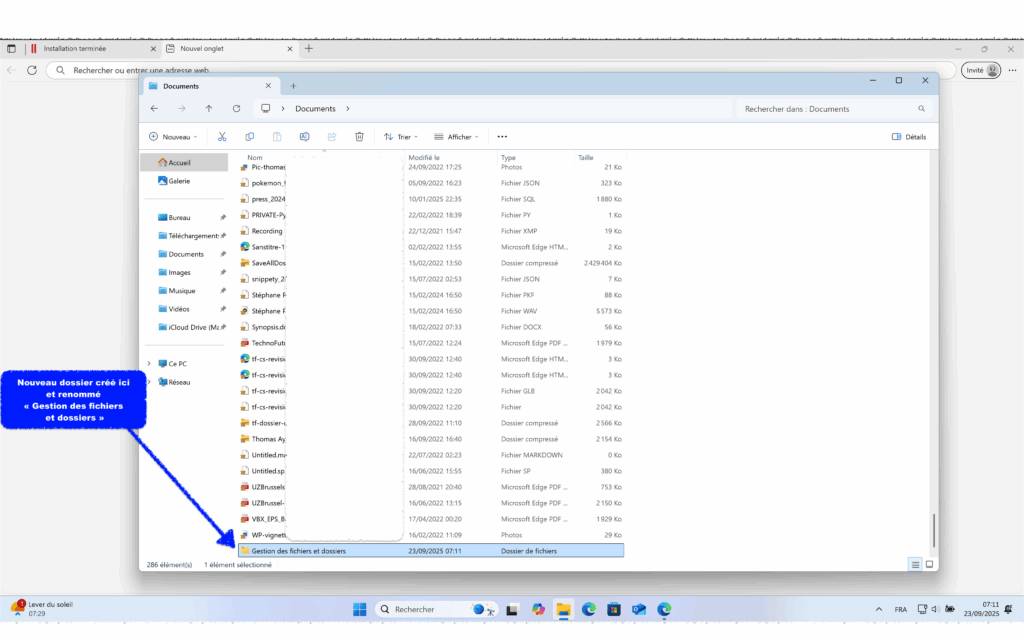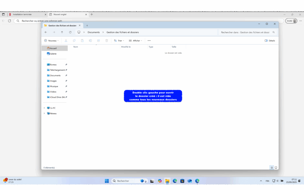 Eviter de créer des dossiers sur le « Bureau ». Créer des dossiers dans « Documents ». Fiche Microsoft « Creer un dossier ».